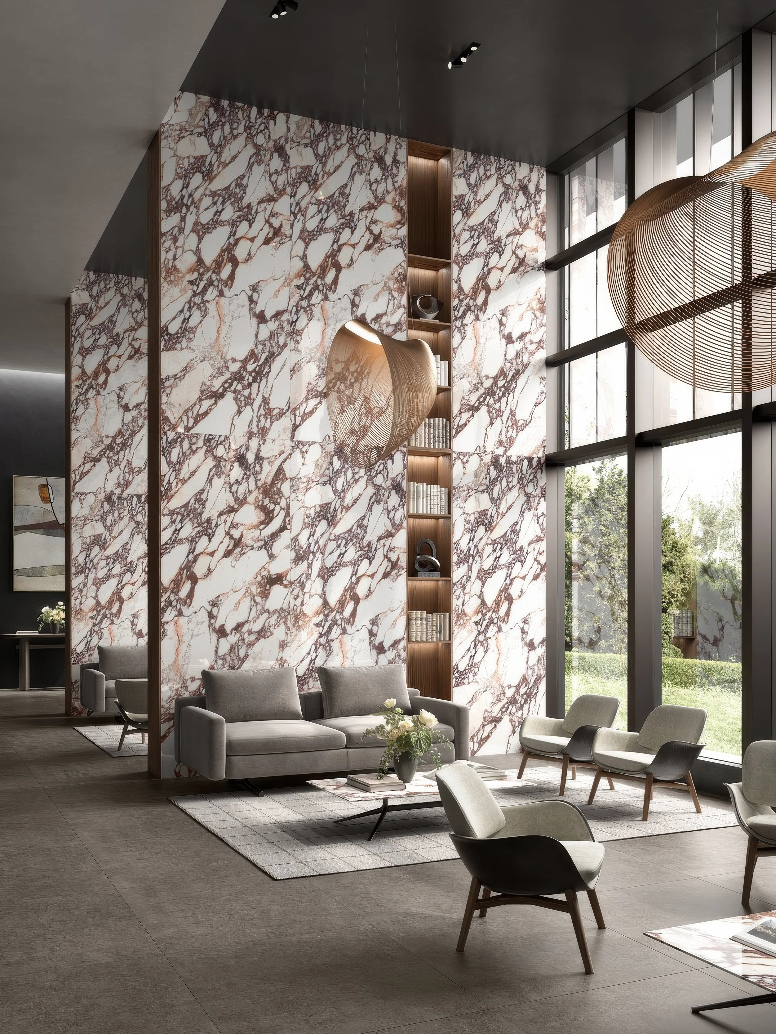 Calacatta Viola is a 5x10, 12mm porcelain slab available in both polished and natural finishes. Featuring a white base with bold violet and burgundy veining across multiple faces, it embodies timeless Italian elegance and luxury.