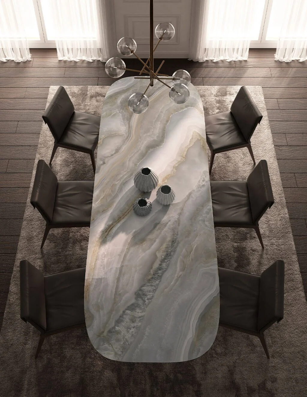 Onice Grigio — 5x10, 12mm polished porcelain slab with a single face design featuring grey and off-green onice tones, perfect for elegant modern spaces.