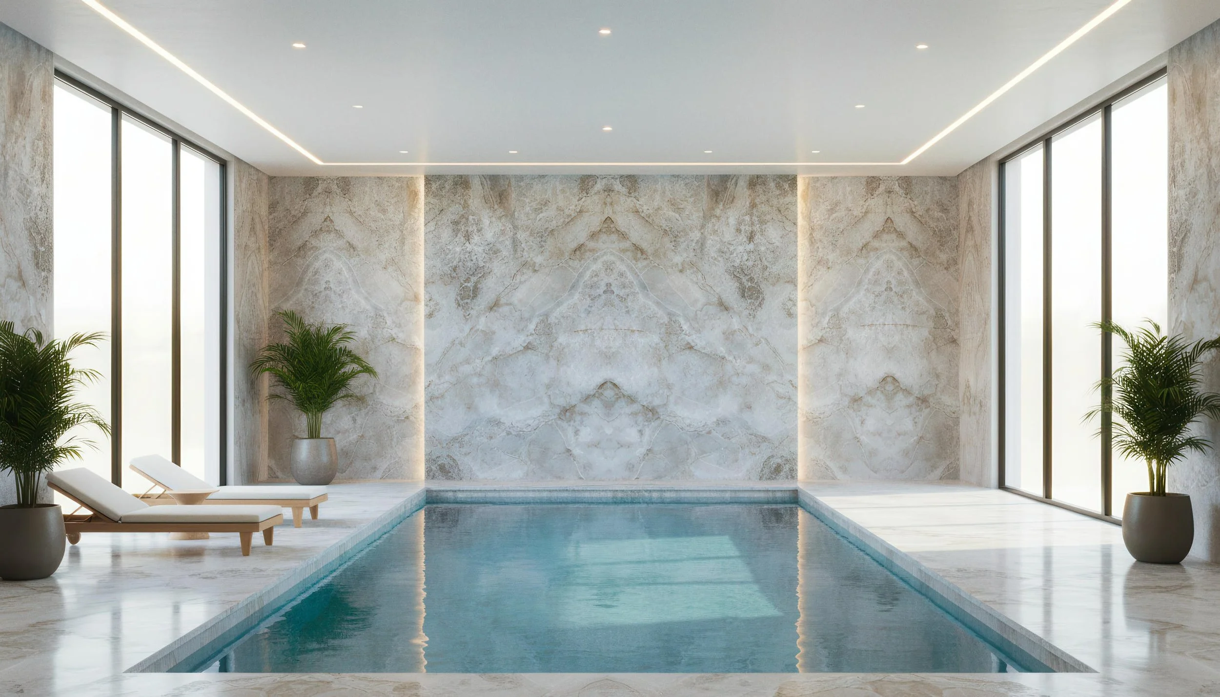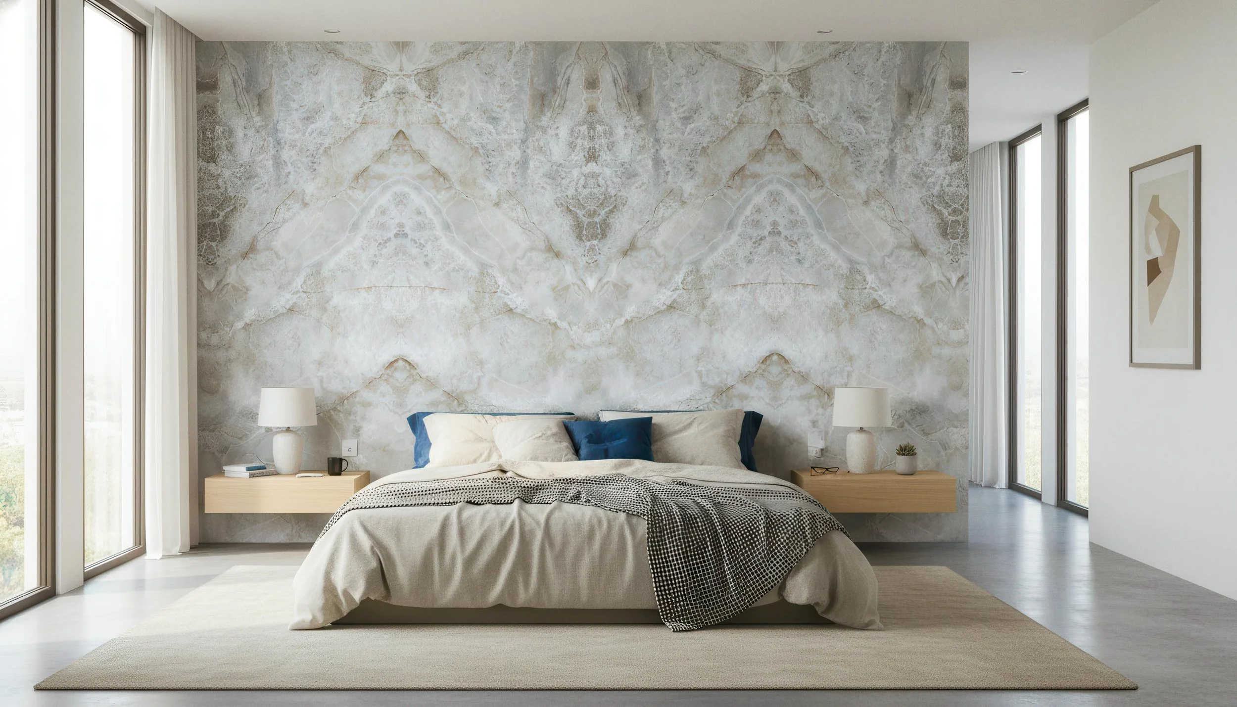 Diamond Beige showcases a soft beige base enriched with grey, brown, and orange oyster tones arranged in a stunning bookmatch pattern. This 4x9-foot, 9mm porcelain slab with a polished finish is perfect for wall cladding, feature panels, and decorative surfaces. Its elegant and dramatic bookmatched design adds sophistication and visual continuity to luxury interiors.