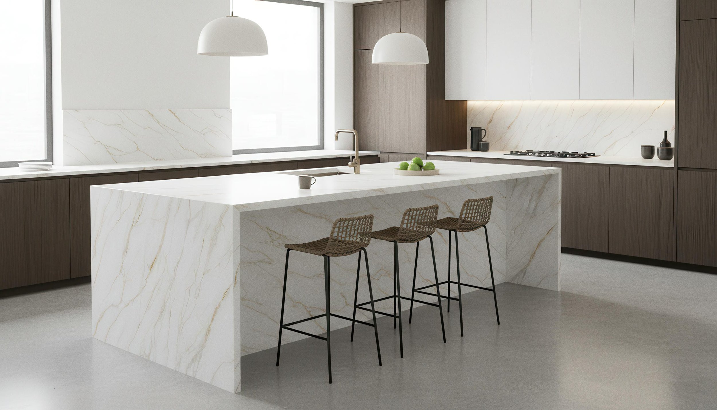 Prestige showcases a beautiful white base accented with delicate gold veining in a 3-face vein-matched (ABC) pattern, offering a sophisticated marble-inspired look. This 4x10-foot, 9mm polished porcelain slab is ideal for wall cladding, flooring, and decorative surfaces. Elegant and timeless, Prestige adds subtle luxury and refinement to modern and classic interiors.