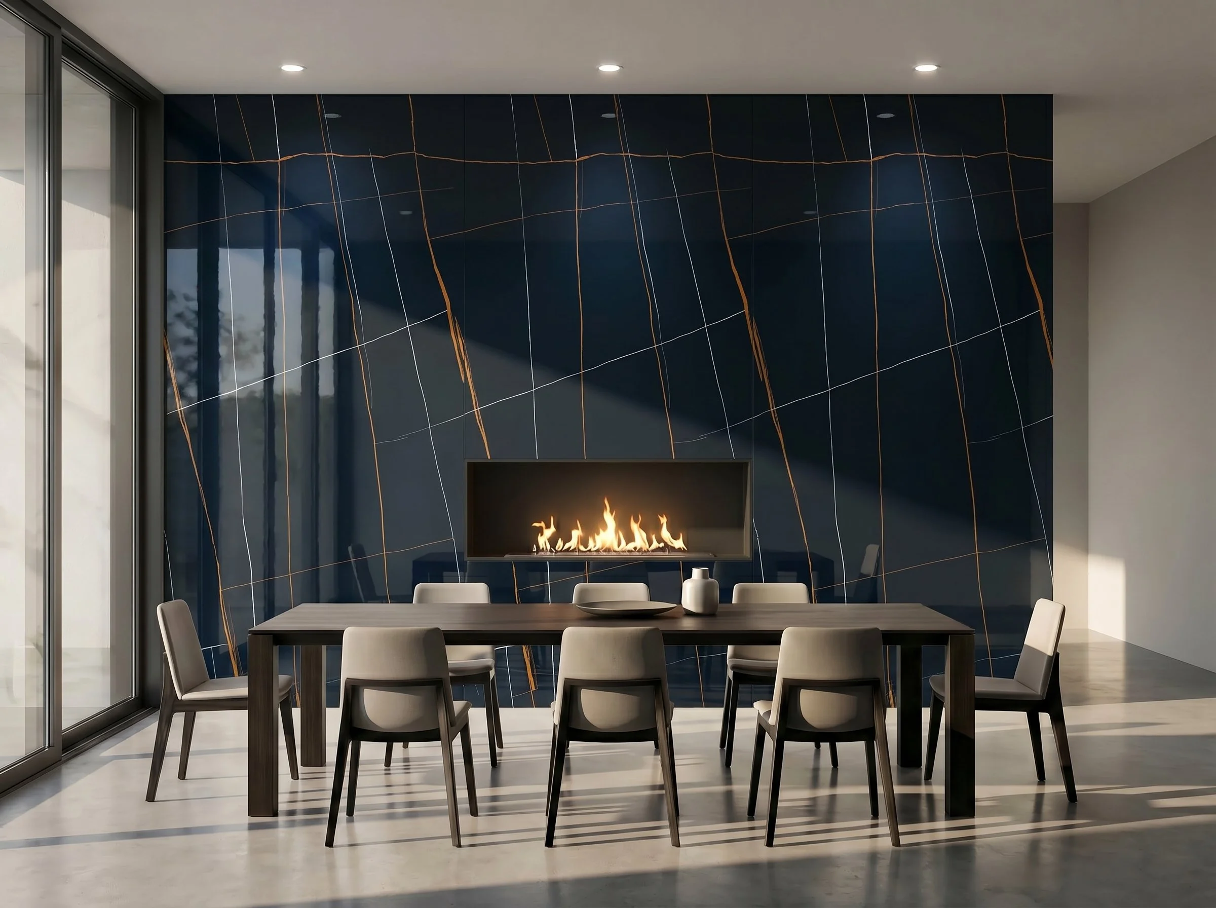 Sahara Red is a 4x8, 9mm single-face porcelain slab with a polished finish. Its deep black base accented by vivid red veining creates a dramatic, high-impact look perfect for feature walls, decorative panels, and sophisticated interiors.